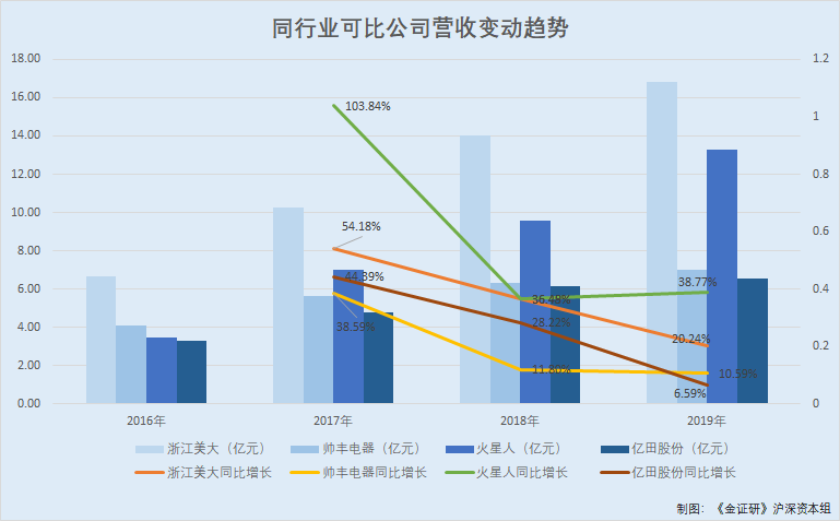反观同行,2016-2019年,浙江美大的营业收入分别为6.66亿元、10.26亿元、14.01亿元、16.84亿元,2017-2019年营业收入增速分别为54.18%、36.49%、20.24%。