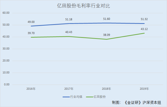 可见,2016-2019年,亿田股份的毛利率持续低于行业均值水平。
