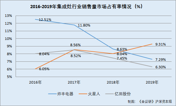 根据《金证研》沪深资本组统计分析,2016-2019年,亿田股份集成灶销售量市场占有率分别为8.04%、8.52%、7.45%、6.3%。呈下滑态势。