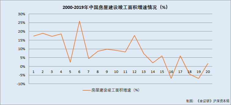 据东方财富Choice数据,2000-2019年,中国房屋建设竣工面积增速分别为17.25%、18.97%、17.1%、18.55%、2.41%、25.79%、4.52%、8.55%、9.8%、9.22%、8.35%、17.62%、7.35%、2.02%、5.94%、-6.9%、6.09%、-4.37%、-6.96%、1.61%。