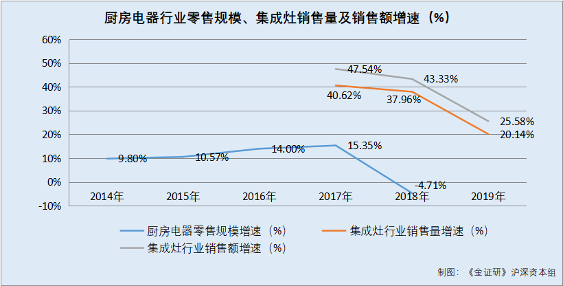 据招股书援引的信息,2014-2018年,厨房电器行业零售规模增速分别为9.8%、10.57%、14%、15.35%、-4.71%。