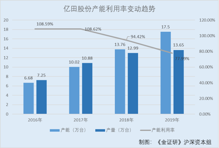 通过募投项目,亿田股份将新增产能近九成,而其产能利用率呈下滑趋势,亿田股份或将面临产能难以“消化”的困境。
