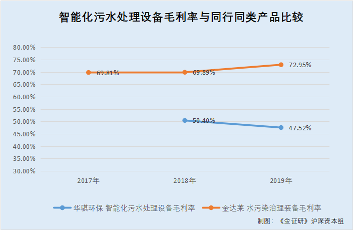 没有对比,就没有“伤害”。华骐环保的智能化污水处理设备毛利率,一直低于金达莱的水污染治理装备毛利率,并且金达莱水污染治理装备毛利率逐年走高,而华骐环保智能化污水处理设备的毛利率在2019年有所下降。