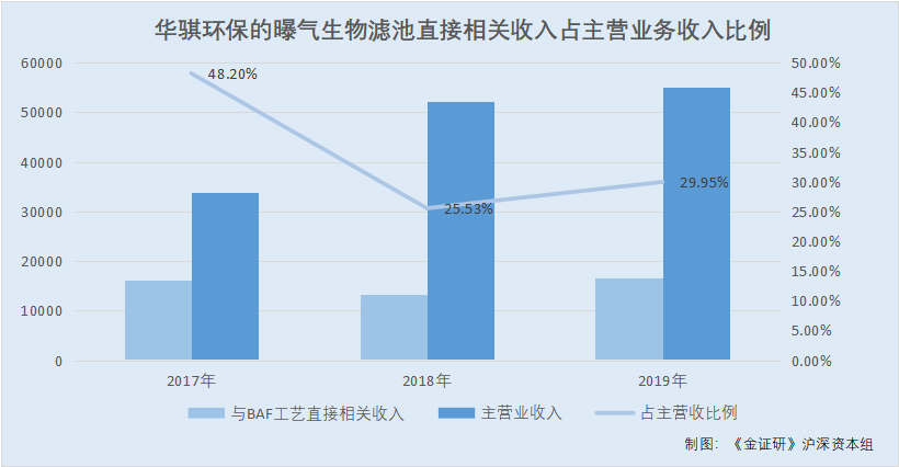 据《金证研》沪深资本组统计,2017-2019年,与曝气生物滤池工艺直接相关收入,占华骐环保当期主营业收入的比例,分别约为48.2%、25.53%、29.95%。
