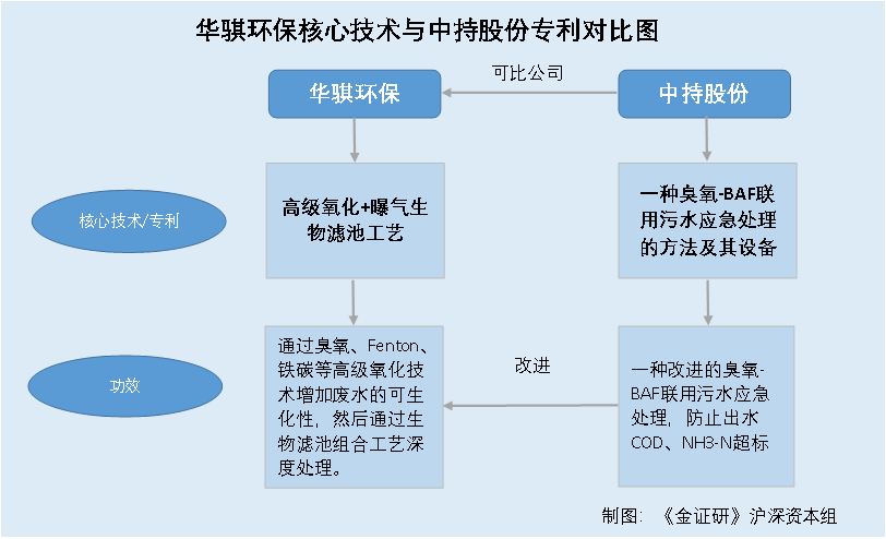 也就是说,华骐环保声称的高级氧化+曝气生物滤池(BAF),其实就是行业中广泛使用的“臭氧-BAF联用”污水处理工艺,这项技术却存在氨氮排放超标的风险。而其同行业可比上市公司中持股份,通过研发专利在一定程度上规避了该风险,做到了工艺升级。