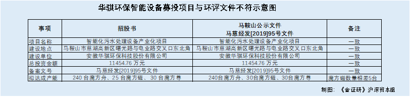 无论是环评备案文件还是环评批复文件,华骐环保智能设备项目拟达成的魔方磁产能都是30台,与招股书存在出入。