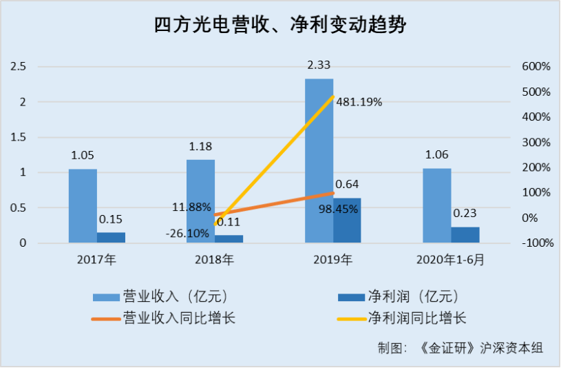 2017-2019年,四方光电的净利润分别为0.15亿元、0.11亿元、0.64亿元,2018-2019年分别同比增长-26.1%、481.19%。2020年1-6月,四方光电实现净利润0.23亿元,同比增长107.55%。