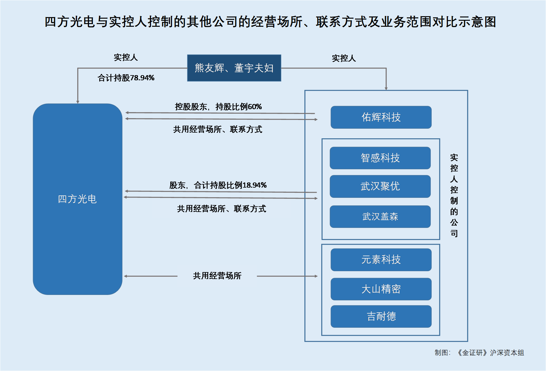 总体来看,四方光电实控人熊友辉、董宇夫妇通过佑辉科技、智感科技、武汉聚优、武汉盖森控股四方光电,而四方光电或与上述4家公司曾共用经营场所和联系方式。同时,熊友辉、董宇夫妇控制的另外3家公司亦或存在与四方光电共用经营场所现象。此外,四方光电控股股东佑辉科技,其业务范围与四方光电“重叠”。四方光电独立性或存缺失。