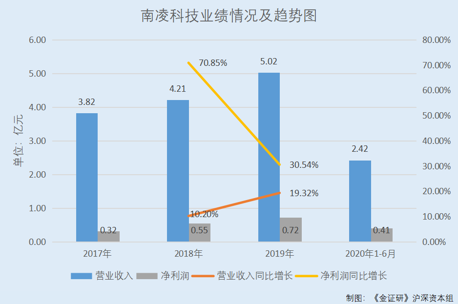 2017-2019年及2020年1-6月,南凌科技营业收入分别为3.82亿元、4.21亿元、5.02亿元、2.42亿元,2018-2019年分别同比增长10.2%、19.32%。