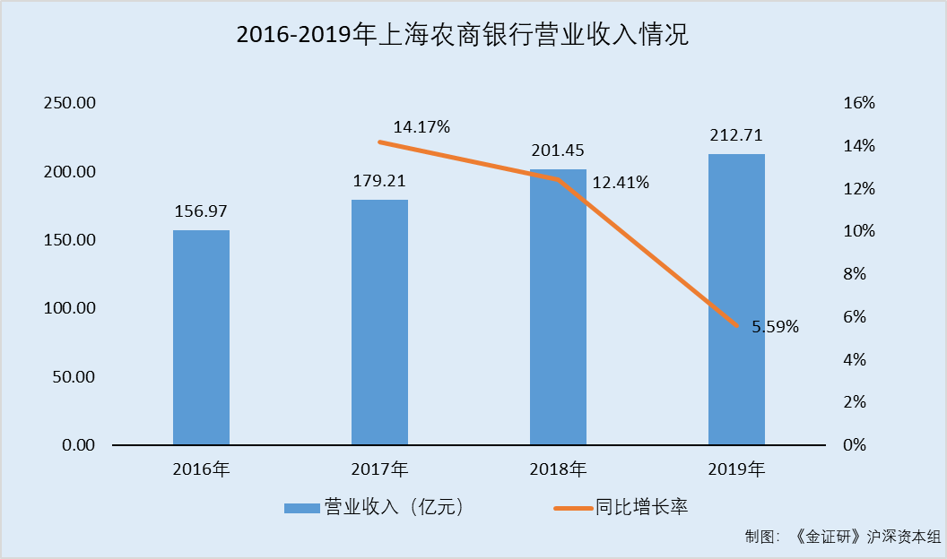 据新版招股书及签署日期为2019年6月19日的招股书(以下简称“2019年招股书”),2016-2019年,上海农商银行的营业收入分别为156.97亿元、179.21亿元、201.45亿元、212.71亿元,2017-2019年分别同比增长14.17%、12.41%、5.59%。