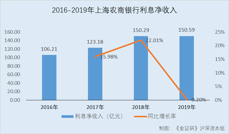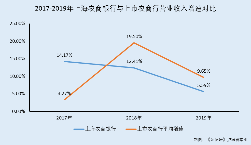 不仅如此,2018-2019年,上海农商银行营业收入增速低于同期上市农商行的平均水平。