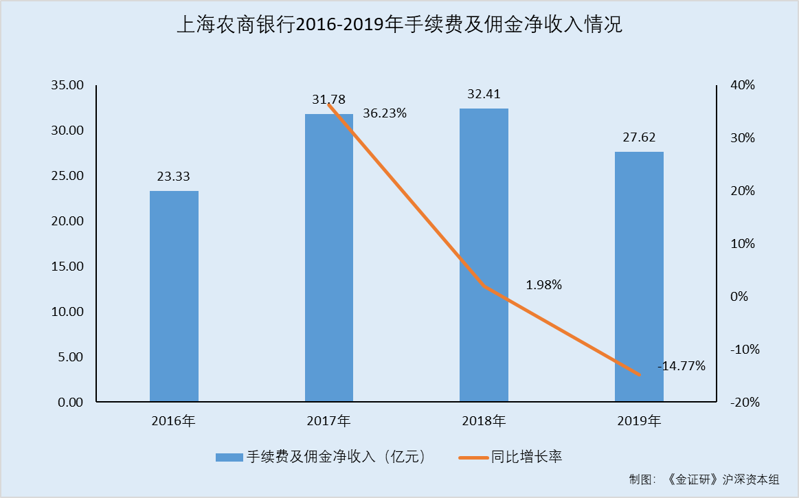 据新版招股书及2019年招股书,2016-2019年,上海农商银行的手续费及佣金净收入分别为23.33亿元、31.78亿元、32.41亿元、27.62亿元,2017-2019年手续费及佣金净收入分别同比增长36.23%、1.98%、-14.77%。