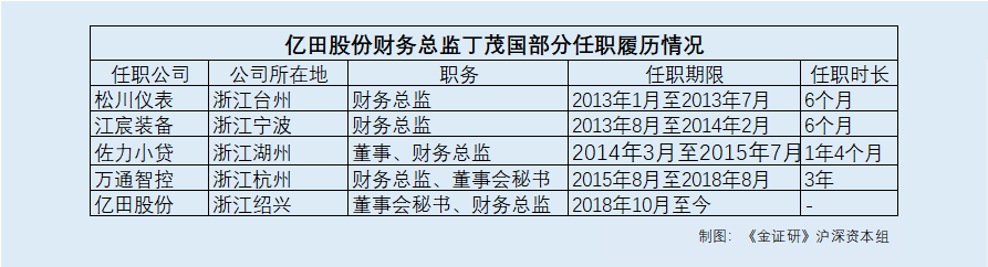 履历显示,2004年7月至2006年11月,丁茂国任浙江天惠会计师事务有限公司审计助理;2006年12月至2009年8月,其任浙江东方会计师事务有限公司审计项目经理;2009年9月至2012年12月,其任中汇会计师事务有限公司审计经理;2013年1月至2013年7月,其任浙江松川仪表科技股份有限公司(以下简称“松川仪表”)财务总监;2013年8月至2014年2月,其任宁波江宸自动化装备有限公司(以下简称“江宸装备”)财务总监;2014年3月至2015年7月,其任佐力科创小额贷款股份有限公司(以下简称“佐力小贷”)董事、财务总监;2015年8月至2018年8月,其任万通智控科技股份有限公司(以下简称“万通智控”)财务总监、董事会秘书;2018年10月至今,其任亿田股份董事会秘书、财务总监。
