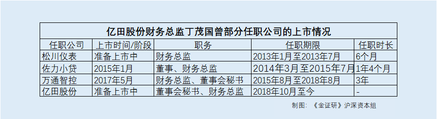 经《金证研》沪深资本组统计,亿田股份财务总监丁茂国曾任职的5家公司中,有4家公司处于已上市或者上市准备阶段。