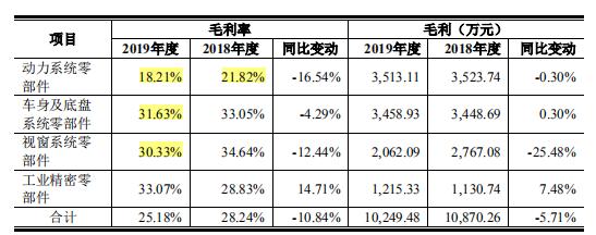 从产品销量看,公司对三叶电机(Mitsuba)、丰田(Toyota)2019年销量较2018年增加,主要系合并金华德的因素,受下游汽车行业产销量下降的影响,2019年公司对主要客户博世、大陆、舍弗勒销量均有所下降;受国六标准影响,2019年精密科技对大陆(Continental)销售国五标准产品销量下降,销量下滑的同时,精密科技主营业务毛利率不乐观,报告期内,精密科技主营业务毛利率分别为28.67%、28.24%、25.18%和26.44%,2019年毛利率水平下降较多。