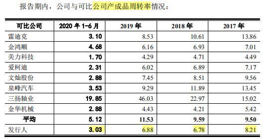 精密科技选择了美力科技、金华机械,与金鸿顺、爱柯迪相近,低于文灿股份、泉峰汽车、雷迪克、三扬轴业为同行业可比公司,2017年-2020年1-6月,公司产成品周转率分别为8.21、6.78 、6.88和3.03,低于可比公司平均水平。同时公司应收账款余额占营业收入比例逐年上升,2020年6月底占比已达到58.76%。