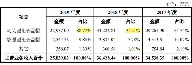 同时对于中瑞电子的主营产品动力型组合盖帽2017年-2019年销售额分别为2.93亿元、3.32亿元和2.29亿元,占公司整体营业收入的84.74%、91.21%和88.77%,该类产品主要应用于下游新能源汽车、电动自行车、电动工具、智能家居等领域。报告期内,该产品毛利率为37.96%、34.96%和29.38%,销售额和毛利率均呈现出快速下滑趋势。