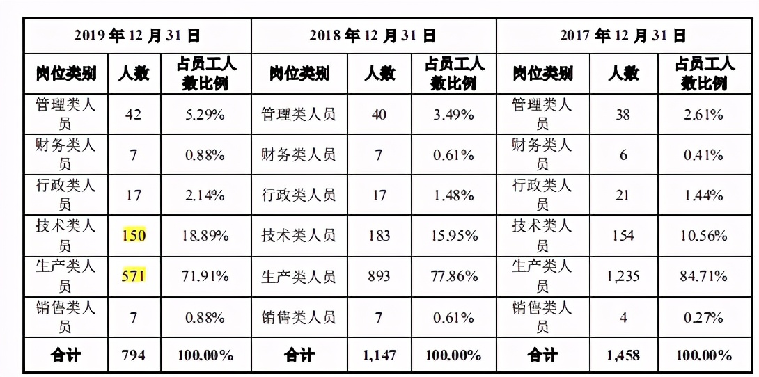 权衡财经iqhcj注意到截至2017年12月31日、2018年12月31日和2019年12月31日,中瑞电子员工总数分别为1,458人、1,147人和794人,2019年流失大量员工,尤其是生产类人员由2017年的1235人减少到2019年的571人,减少了一半还多。对此中瑞电子称主要原因在于,一方面公司持续提升自动化生产水平,减少一线生产工人数量;另一方面,2019年受新能源补贴政策调整的影响,部分新能源汽车应用领域主要客户减少了新增订单需求生产安排,公司相应减少了一线生产工人数量。