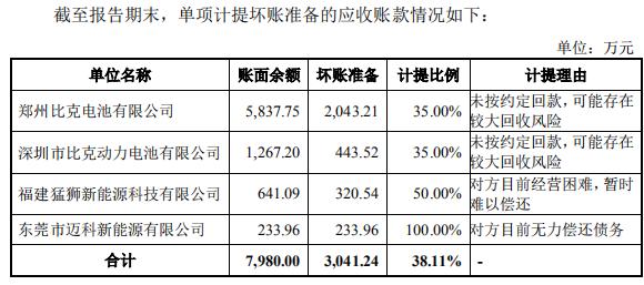 截至2019年12月末,中瑞电子对比克电池(包括郑州比克电池有限公司、深圳市比克动力电池有限公司)的应收账款余额为7,104.95 万元,已按35%计提比例单项计提坏账准备2,486.73 万元。2019年12月,鉴于比克电池未能正常付款,公司与比克电池签署抵债协议,约定以公司采购郑州比克电池有限公司的电池货款冲抵其对比克电池的应收账款。公司已实现部分电池的销售,并根据其他已签订的销售合同陆续安排发货。