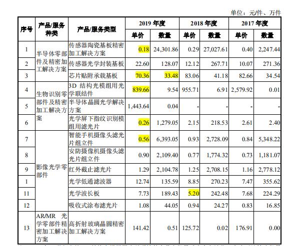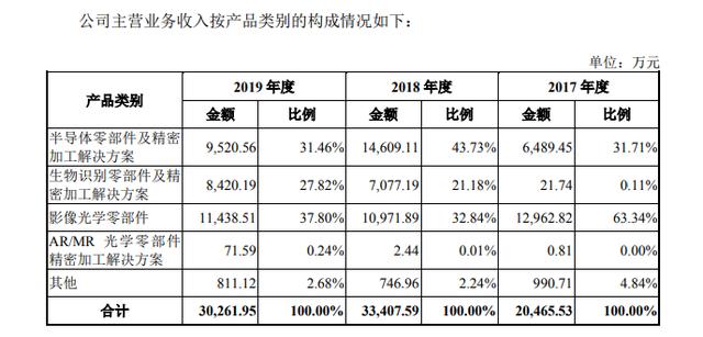 美迪凯主要从事精密光学元器件等的研发、生产和销售,报告期内,其营业收入分别为2.05亿元、3.34亿元、3.04亿元,增幅从64.39%直降至-8.98%,如同过山坡。主要由于美迪凯对京瓷集团的传感器陶瓷基板精密加工解决方案收入下降3,675万元。2017 年为该项业务投资建设专用生产线,京瓷集团在这项目上补贴美迪凯约2,700万元,补贴政策至2018年10月已执行完毕,2019年不再享受;同时受终端产品苹果手机出货量不达预期影响。