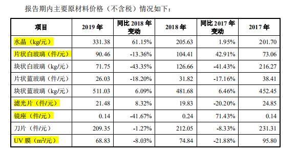 美迪凯的主要原材料包括光学水晶、光学玻璃等光学基材,以及刀片、UV 膜等加工制程所需的材料,光学水晶、光学玻璃等光学基材主要由国外厂商生产。若国际贸易政策出现变动,不仅前述原材料价格出现持续大幅波动,或供应链稳定性都将受到影响。从表中也能看出,价格波动偏大。2017年、2018年和2019年,公司前五大供应商采购金额占总采购金额的比例分别为38.28%、40.96%和42.38%。