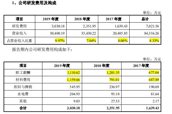 美迪凯2017至2019年累计研发投入7,021万元,3年累计研发投入占3年累计营业收入比例在5%以上,看起来很多,但其员工薪酬占据30%甚至过半。