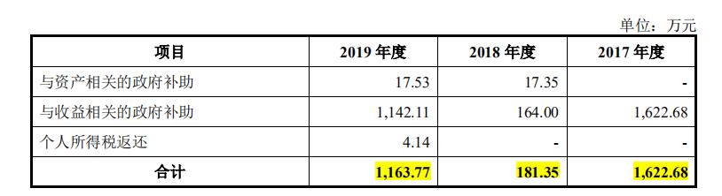 从美迪凯获得的政府补助数额来看,2017年跟2019年都超过了千万级别,而报告期净利润 分别为5,982万元、3,471万元和7,689万元。