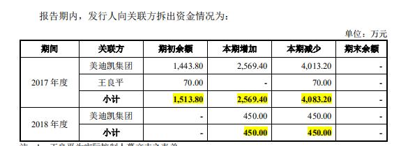 报告期内,除美迪凯与子公司之间的担保情况外,存在关联方为公司及子公司的提供担保金额有效性在内的已多达1.7亿元。美迪凯向关联方拆入资金报告期内曾高达1.1亿元之多,于2019年9月末才清理完毕。同时也存在着美迪凯向关联方拆出资金的情况,于2018 年末清理完毕。