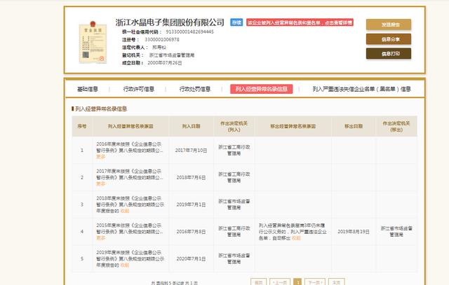 查阅信用中国,水晶电子曾在2016年移入经营异常名录并移出,但此后连续三年又被移入经营异常至今,可谓无视监管。