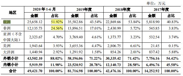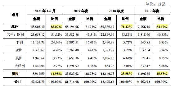 按收入地区分布情况看,报告期内,主要营收来自境外市场,金额较大,分别为0.78亿元、3.03亿元、5.82亿元和4.35亿元,占主营业务收入的比重分别为54.42%、71.42%、71.22%和88.02%,占比较高。2020年上半年来自欧洲的销售收入占比高达51.92%,非洲地区占比达到24.56%,然而2020年3月下旬以来,海外疫情进入暴发期,对当地商业活动产生了较大影响,这意味着,一旦该地区的宏观经济、政策导向等发生变化,则可能对公司的经营业绩产生影响。