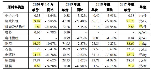 2017年-2020年1-6月,派能科技前五大供应商变动频繁,2018年派能科技的前五大供应商较2017年变化了3家,2019年前五大供应商较2018年变化了2家,2020年1-6月前五大供应商较2019年变化了4家。 派能科技主要产品为磷酸铁锂储能电池系统,对外采购的主要原材料包括电子元件、磷酸铁锂、机壳及结构件、铜箔、石墨、电解液、铝塑膜和隔膜等。受市场供需关系等影响,报告期内公司的主要原材料的价格总体呈下降趋势。权衡财经iqhcj注意到,磷酸铁锂作为公司最主要的原材料,单价下降幅度很大。