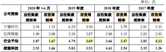 在存货周转率方面,派能科技存货周转率低于同行。2017-2019年期间,派能科技的存货周转率分别为1.26次、2.54次、3.53次和1.66次,均低于行业平均水平。库存金额高且周转率低,也将带来资金风险。
