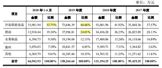 立高食品主要从事烘焙食品原料及冷冻烘焙食品的研发、生产和销售,销售产品包括奶油、水果制品、酱料、巧克力等烘焙食品原料和冷冻烘焙半成品及成品,此外还生产部分休闲食品。2017-2020年1-6月,营业收入分别为9.56亿元、13.13亿元、15.84亿元和6.7亿元,增速放缓;净利润分别为4398.73 万元、5230.86 万元、1.81亿元和0.76亿元,从营收来看立高食品呈一路增长态势,近两年增速放缓;从净利润来看2019年净利润暴增246%,但或难持续。