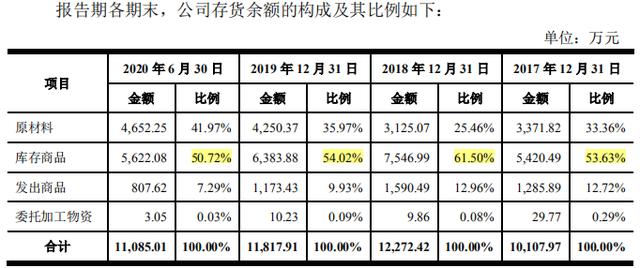 值得注意的是报告期各期末,公司存货价值规模较大,分别为1.0亿元、1.22亿元、1.17亿元和1.1 亿元,占流动资产比例分别为43.02%、39.28%、26.47%和30.40%。在存货余额构成中,库存商品一直占比高达50%以上,2018年末库存商品占比更是超过了60%。但对于食品企业而言,存货的上升不仅会导致存货跌价,也存在坏账、占用现金流等隐患。