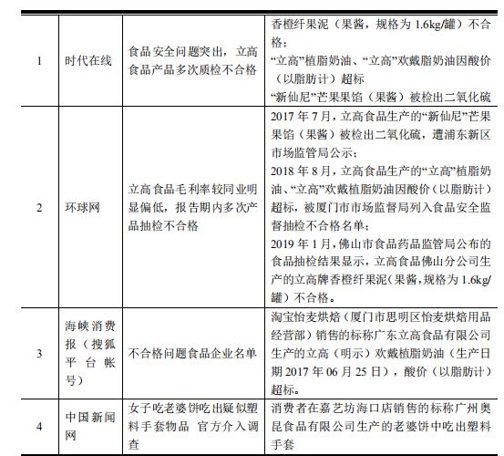 近年来,消费者对食品安全的要求与日俱增,食品安全问题也日益受到监管部门和社会舆论的高度关注。食品安全问题对公司的品牌形象以及相关产品的销售会造成直接影响。 然而近几年来立高食品的安全问题频频发生,食品曾多次抽检不合格。2017年其生产的"新仙尼"芒果果馅被检出二氧化硫,2018年立高品牌下又有两批次植脂奶油产品被检出酸价(以脂肪计)超标,2019年1月,佛山市食品药品监管局公布的食品抽检结果显示,立高食品佛山分公司生产的规格为1.6kg/罐的立高牌香橙纤果泥(果酱)不合格。
