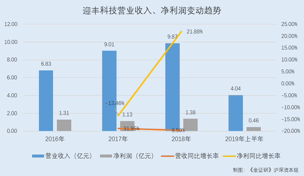 据招股书,2016-2018年及2019年上半年,迎丰科技的营业收入分别为6.83亿元、9.01亿元、9.87亿元、4.04亿元,2017-2018年分别同比增长31.95%、9.5%。