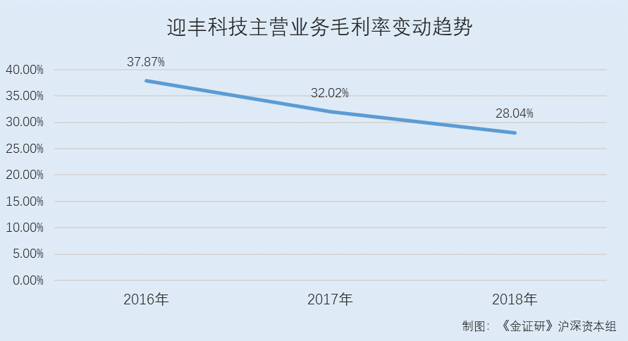 即2016-2018年,迎丰科技毛利率逐年下滑,累计下降了近10个百分点。