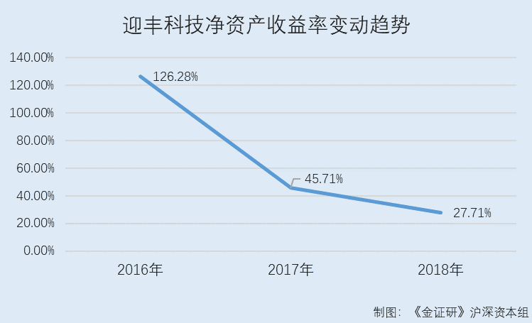 2016-2018年,迎丰科技的扣非加权平均净资产收益率分别为126.28%、45.71%、27.71%。