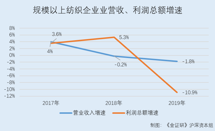 据国家统计局数据,2017-2019年,中国规模以上纺织业企业的营业收入分别同比增长4%、-0.2%、-1.8%,利润总额分别同比增长3.6%、5.3%、-10.9%。