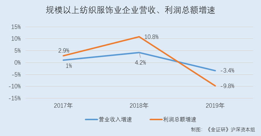 据国家统计局数据,2017-2019年,中国规模以上纺织服装、服饰业(以下简称“纺织服饰业”)企业营业收入分别同比增长1%、4.2%、-3.4%,利润总额分别同比增长2.9%、10.8%、-9.8%。