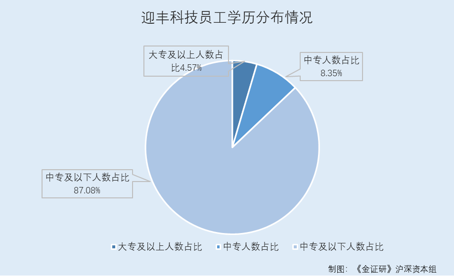 据招股书,截至2019年6月30日,迎丰科技在册员工总数为1,881人。其中,大专及以上学历86人,占总人数比例4.57%;中专学历157人,占总人数比例8.35%;中专以下学历1,638人,占总人数比例87.08%。