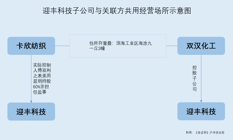 显然,卡欣纺织的住所,与上述迎丰科技拥有的房产地址、迎丰科技子公司双汉化工登记的住所一致,卡欣纺织是否存在与迎丰科技共用经营场所的嫌疑?其能否保证其经营独立性?尚未可知。