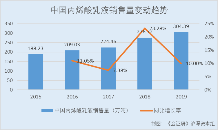 据中国涂料工业协会数据,2015-2019年,中国丙烯酸乳液销售量分别为188.23万吨、209.03万吨、224.46万吨、276.72万吨、304.39万吨,2016-2019年分别同比增长11.05%、7.38%、23.28%、10%。