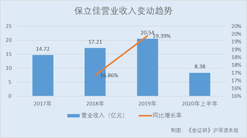 2017-2019年及2020年上半年,保立佳的营业收入分别为14.72亿元、17.21亿元、20.54亿元、8.38亿元,2018-2019年分别同比增长16.86%、19.39%。