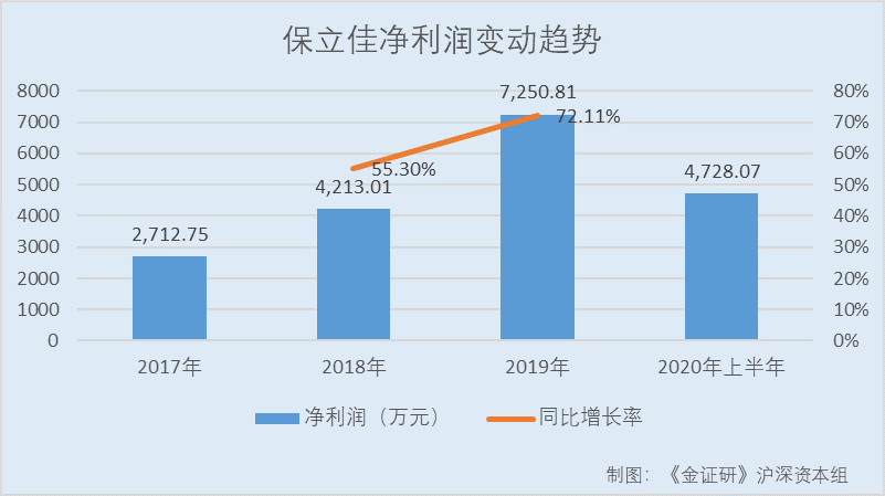 同期,保立佳的净利润分别为2,712.75万元、4,213.01万元、7,250.81万元、4,728.07万元,2018-2019年分别同比增长55.3%、72.11%。