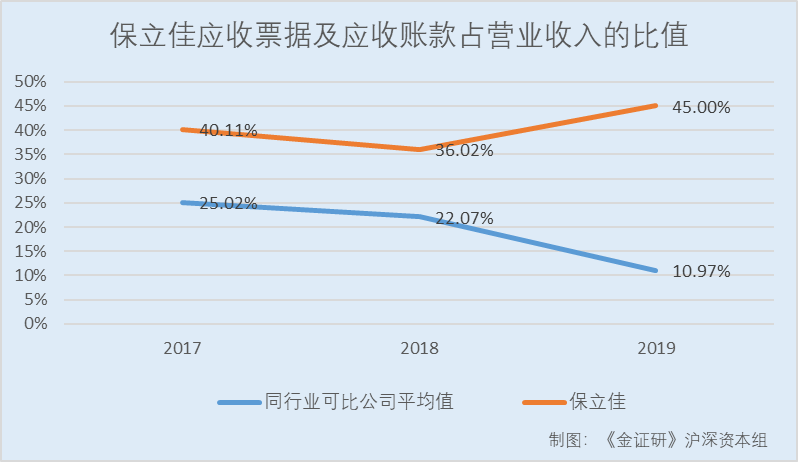 2019年,保立佳应收票据及应收账款占营收的比重高达40%,且高于同行业平均水平。
