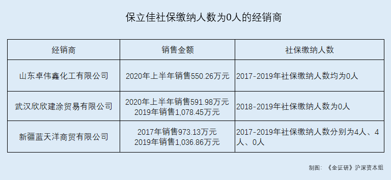 由上述情形或表明,报告期内,卓伟鑫、欣欣建涂均为保立佳的前十大经销商之一,保立佳与上述两家经销商的交易额逾五百万元,而卓伟鑫、欣欣建涂社保缴纳人数常年为0人,也曾与数十家企业共用邮箱和联系电话,卓伟鑫、欣欣建涂或为“零人”公司。且保立佳还向蓝天洋商贸销售额达上千万元,蓝天洋商贸社保缴纳人数也“寥寥无几”。