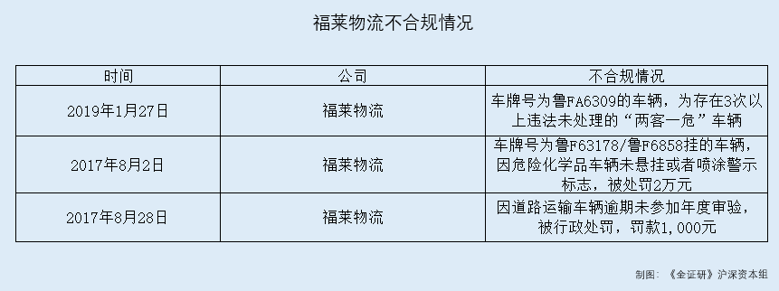 此外,2017年8月,福莱物流因道路运输车辆逾期未参加年审遭行政处罚。