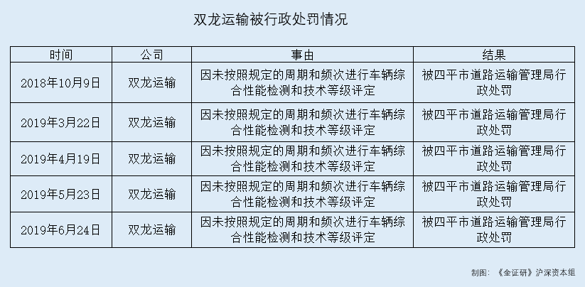 2018年10月至2019年6月,双龙运输五次因未按照规定进行车检等问题而遭处罚。