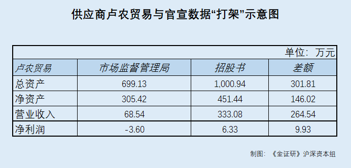 即招股书披露卢弄贸易的总资产、净资产、营业收入、净利润,较之“官宣”数据分别多出301.81万元、146.02万元、264.54万元、9.93万元。